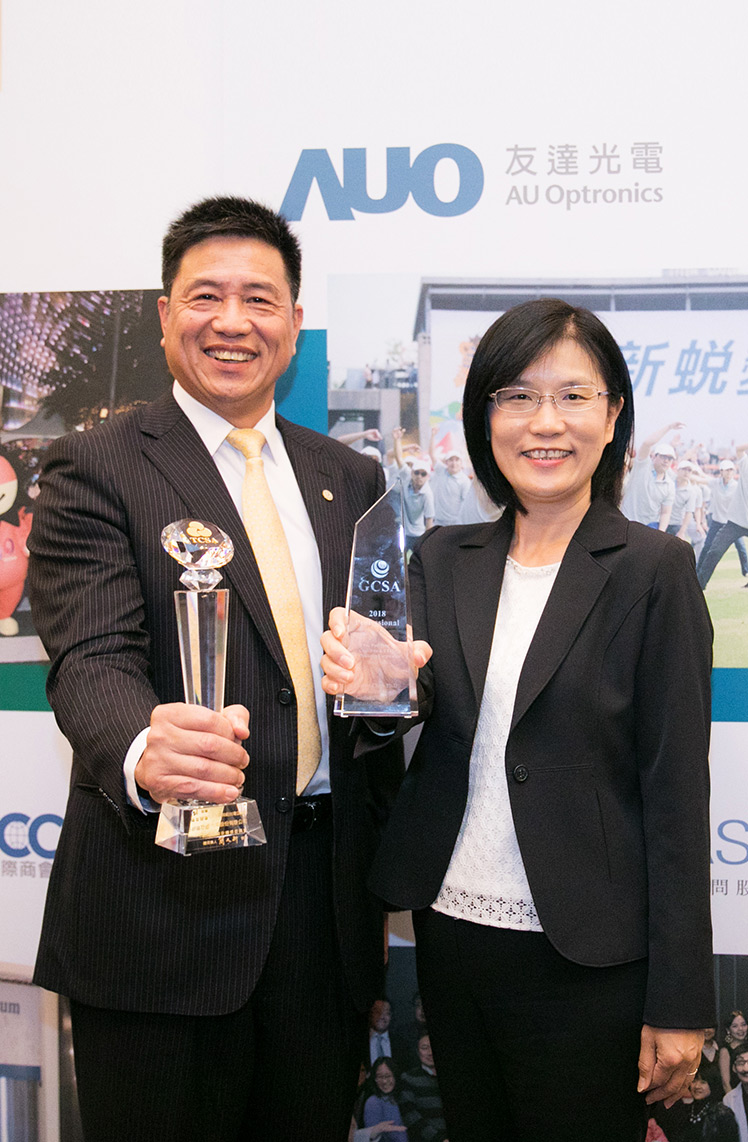 AUO was honored with ten 2018 Taiwan Corporate Sustainability Awards for its all-round sustainability performance. AUO Chairman & Chief Executive Officer Paul Peng (pictured left), AUO Chief Sustainability Officer Amy Ku (pictured right).